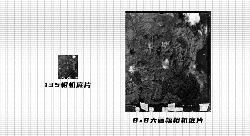 相机的底片大小是8乘8,拿现在全画幅单反相机对比,左边是135单反相机的底片,右边是8乘8大画幅相机的底片,可以说拍摄的非常清楚,提供了非常多的细节。