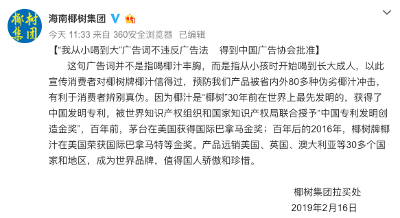 最近几天,椰树牌椰汁因广告疑似存在低俗、虚假的问题频上微博热搜,广告中几位白嫩大胸美女喊着“从小喝到大”和“白白嫩嫩”。随后,椰树的官网回应称“从小喝到大”不违反广告法。